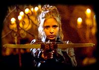 (seen at the right, held by Sarah Michelle Gellar) A missile weapon of the middle ages used for it's distance range and ability to pierce armor. The crossbow can hit a target as far away as 150 ft. Buffy put it to good use against Angel and the Master in the first season. Buffy used an older model made of wood which only carries 3 extra bolts (which are made of wood with a metal arrow at one end) but the technology of crossbows has long since become much more advanced. Several other versions have been used since the first season. In the season 3 episode, "The Wish," a smaller, hand-held, metal crossbow was used by the Buffy from an alternate universe.