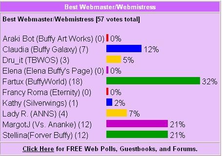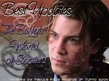 Per quanto riguarda Best Community scelgo The Buffy's World of Spoilers. Si doveva valutare il coinvolgimento dei visitatori. Bhè in Tbwof ho notato il maggior coinvolgimento e il maggior numero di visitatori iscritti. Anche se c'è da dire che Tbwof merita la sua vittoria anche per la fama che si è fatto nel corso di tre anni. Inoltre a questo si aggiunge che le news e gli spoiler arrivano sempre anticipatamente rispetto agli altri siti/newsgroup e gli iscritti li commentano con fervore ^_^.