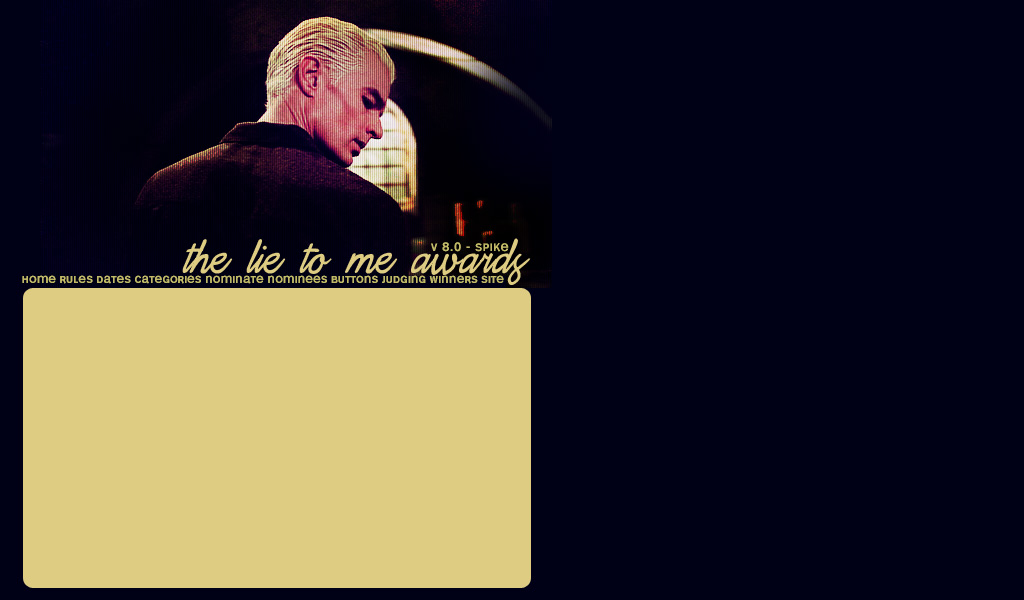 Yes, it's a happy belated second birthday to the site. Secondly, we're running late for round 8, yes, but RL is kicking my ass. Sue me. I'll try to get this wrapped up and start round 8 ASAP. Thirdly, the round eight layout is obviously up, featuring the wonderful Spike. Yay!